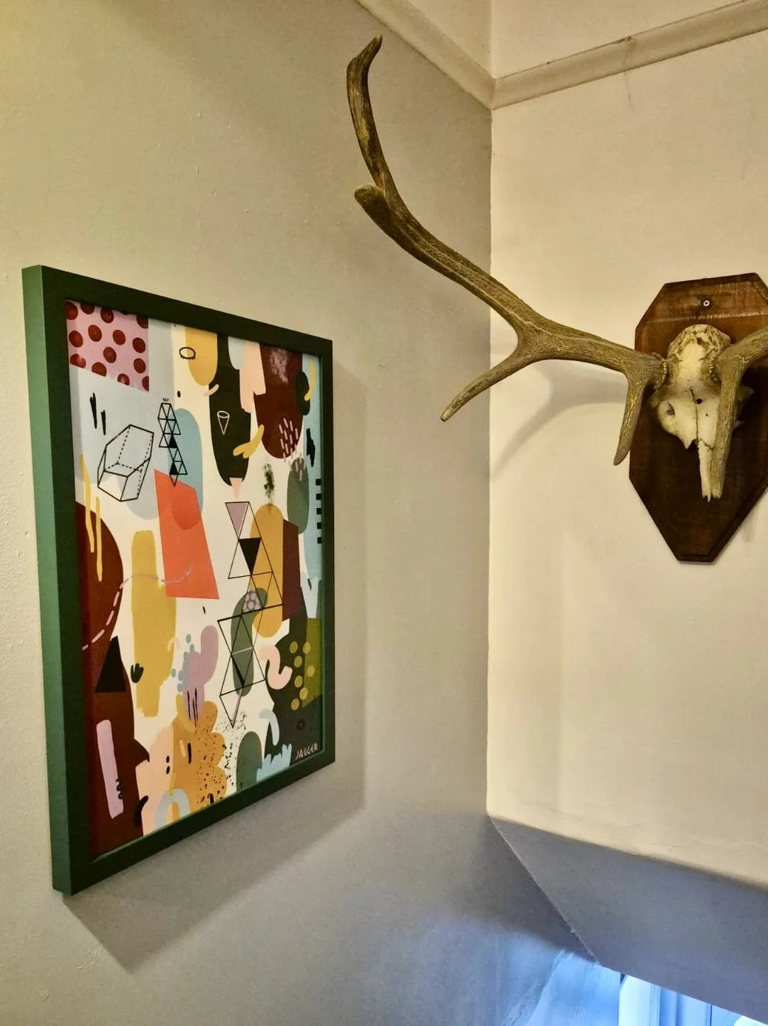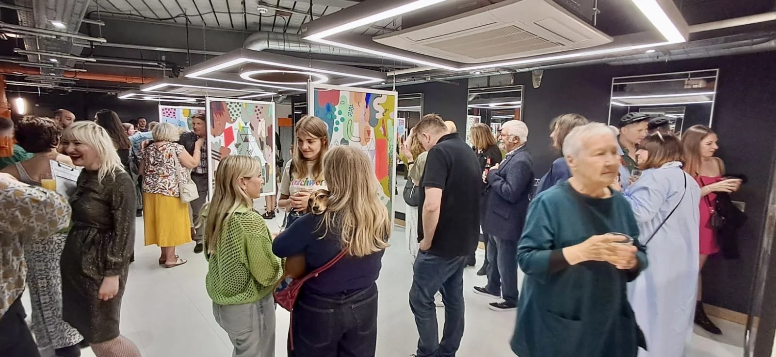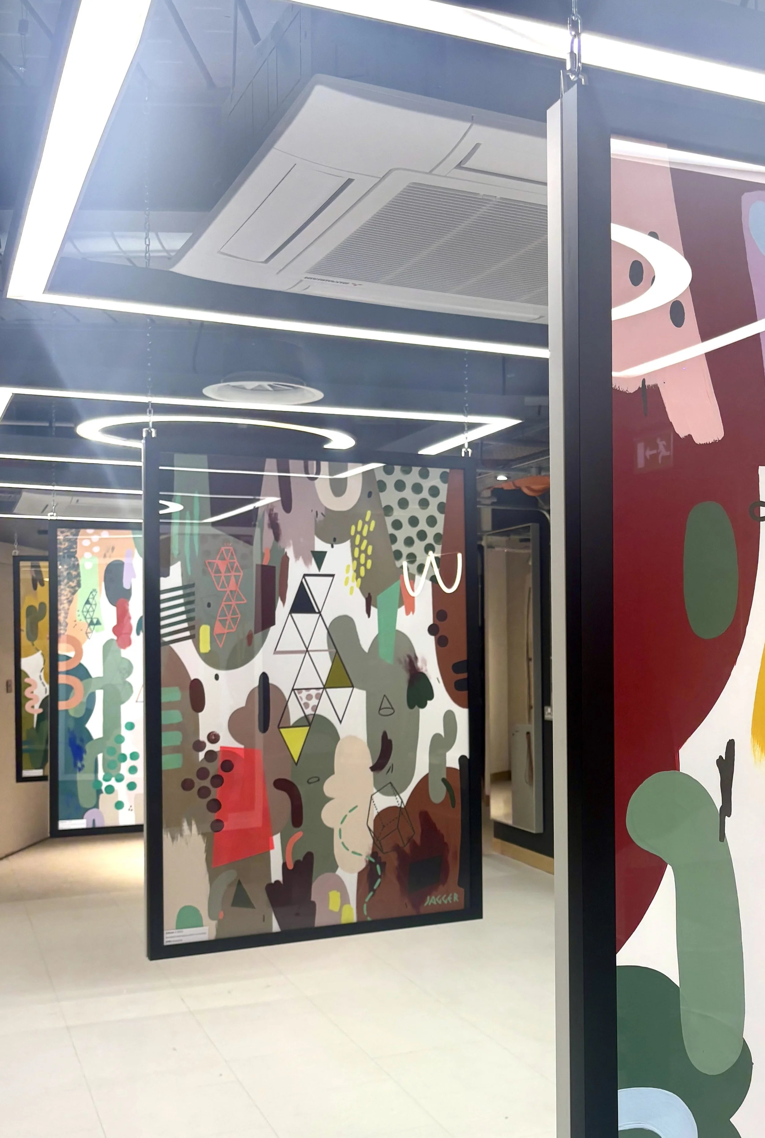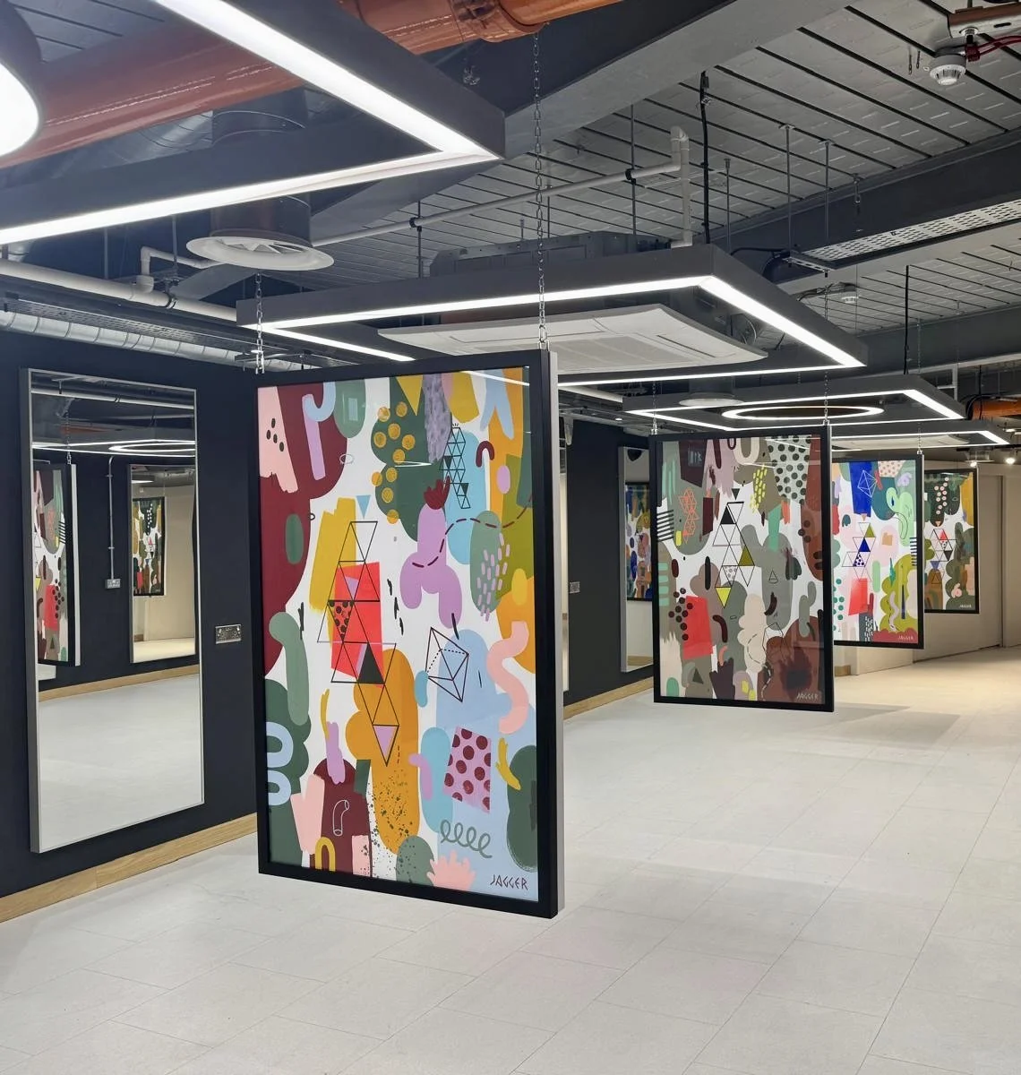 The paintings were framed in black and white and hung back to back from the ceiling of Gareth Vance’s new salon in Leeds.