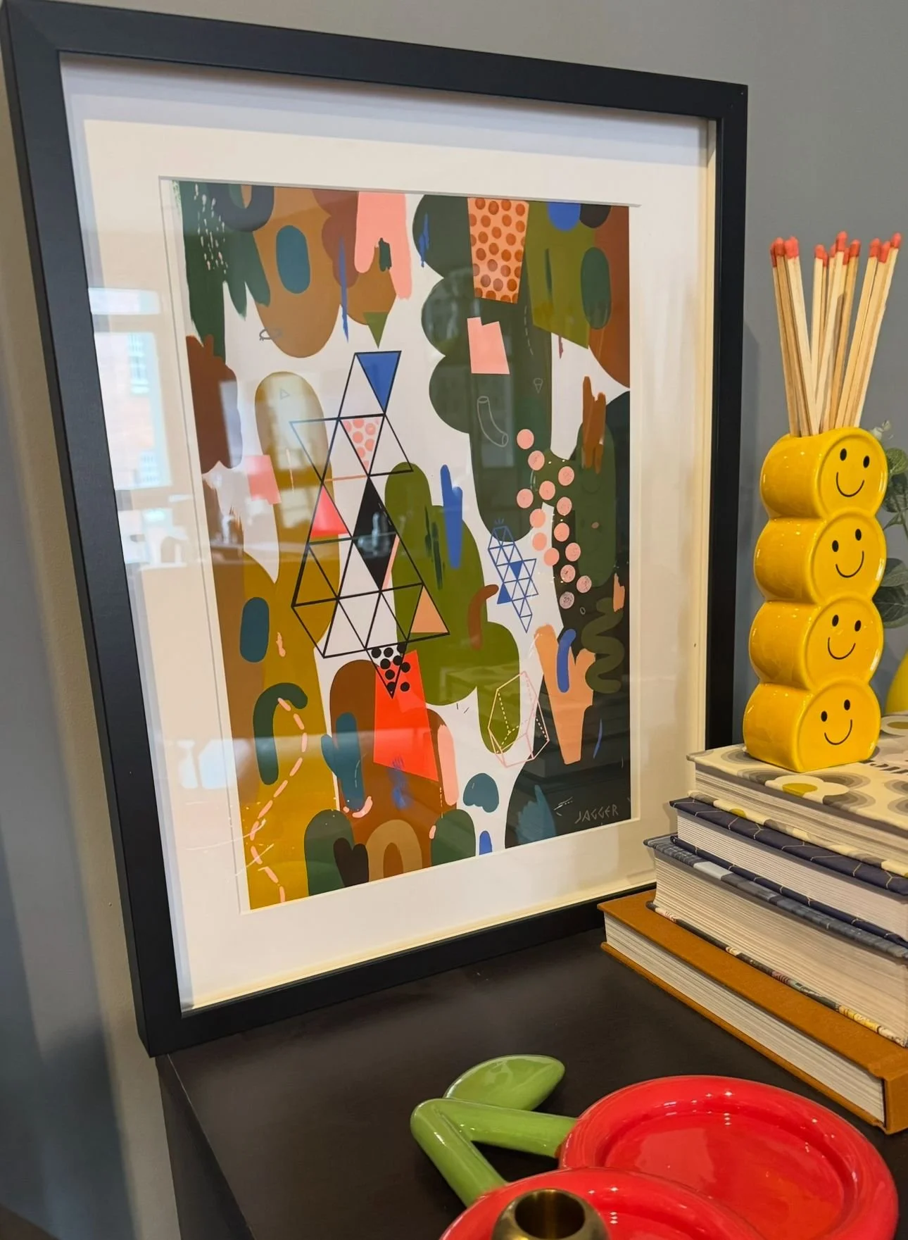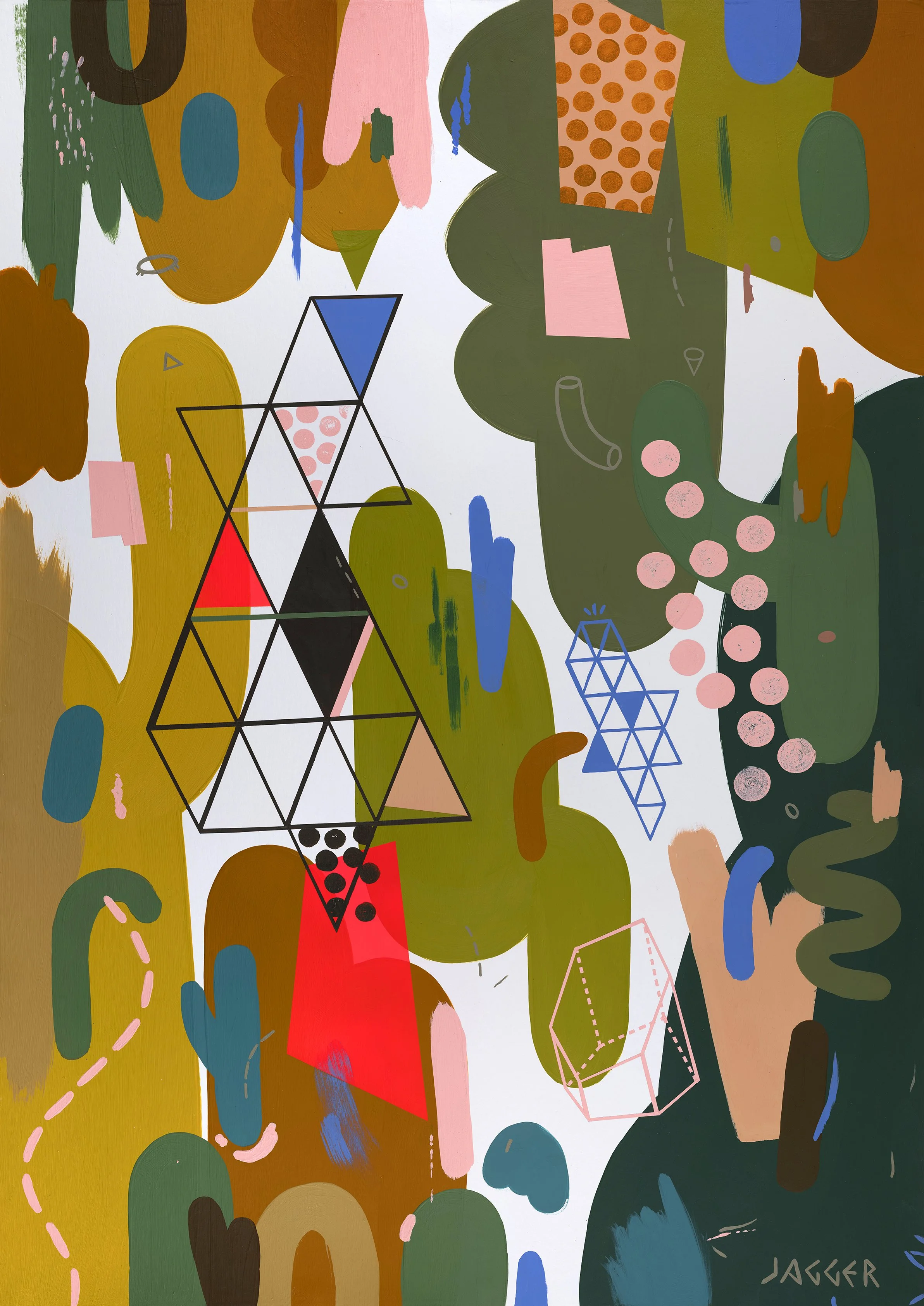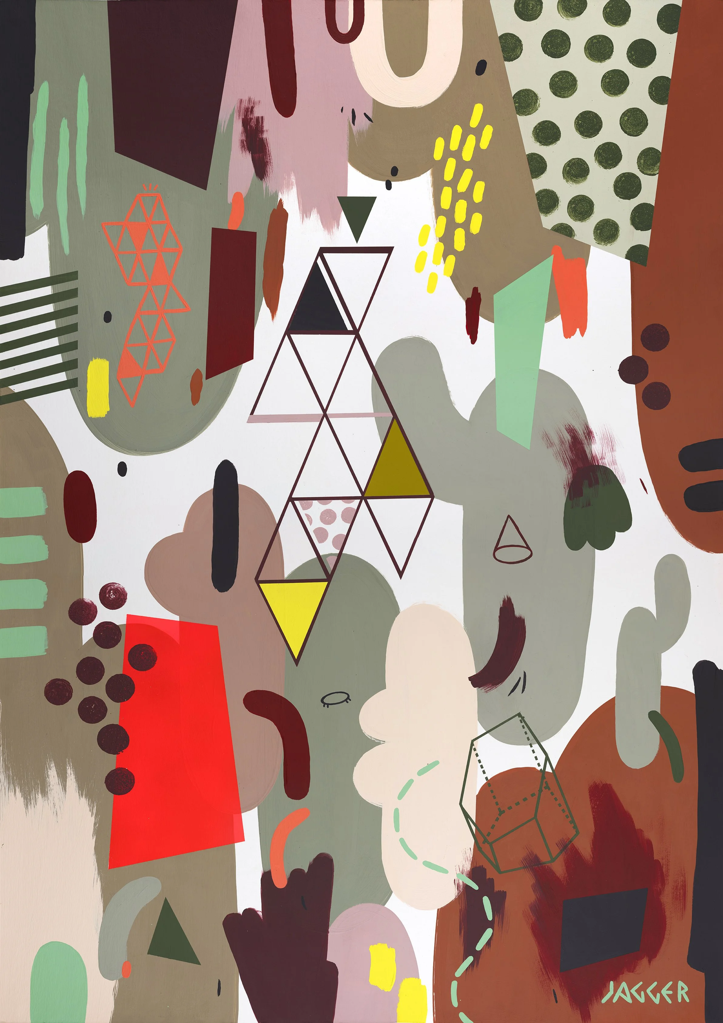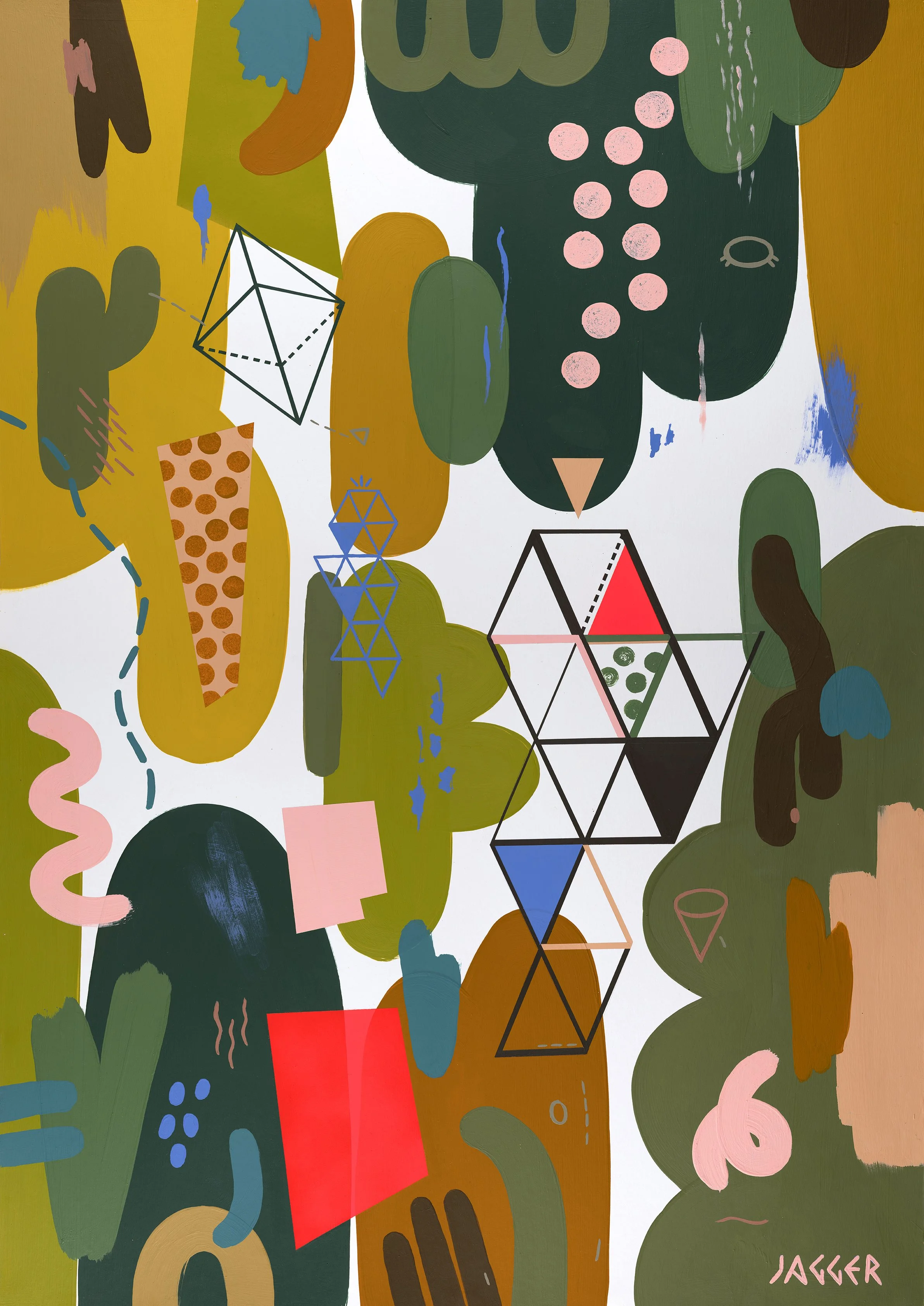 Earthy palette of muted greens, browns and terracotta tones punctuated by pops of coral, yellow and mint.