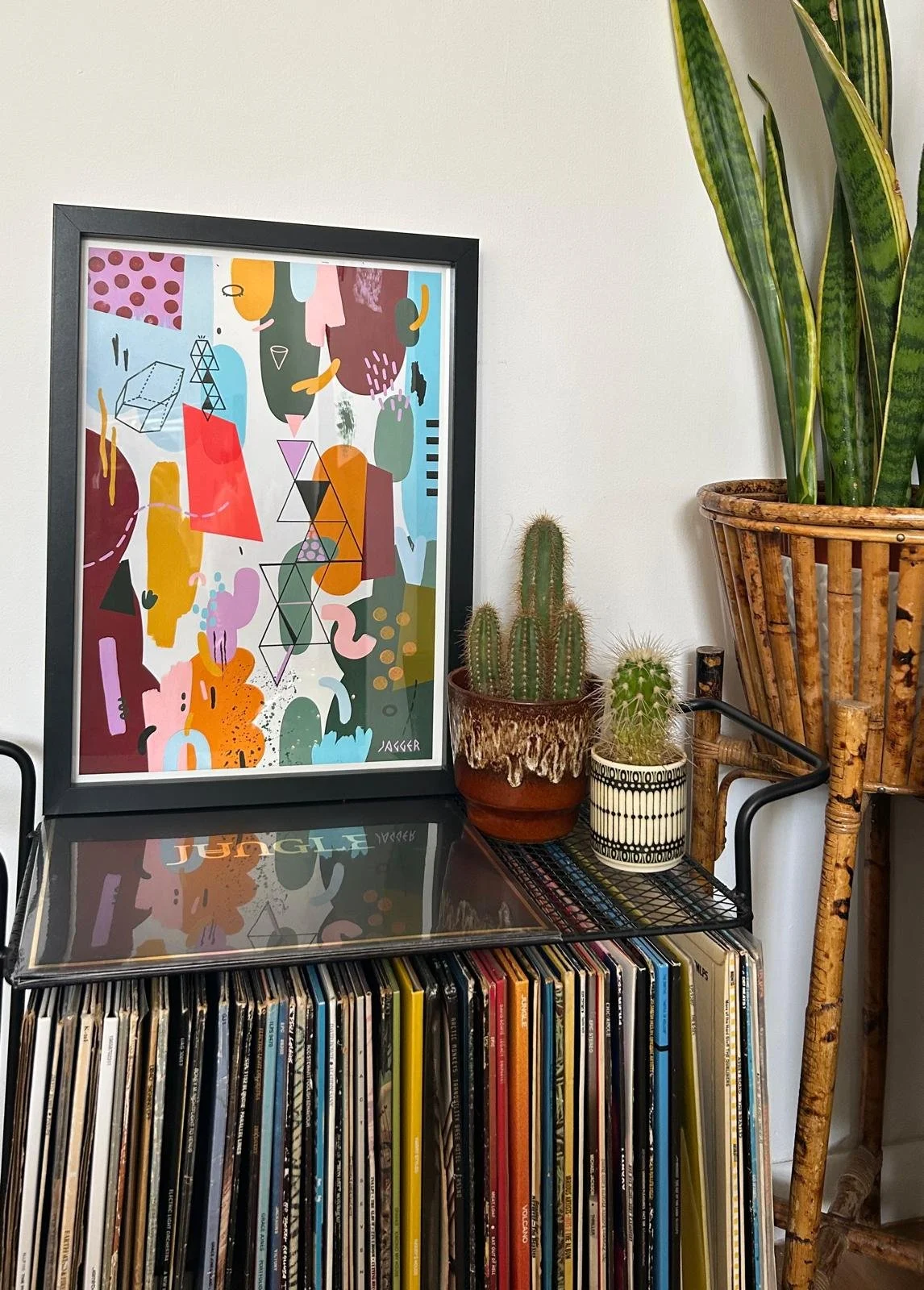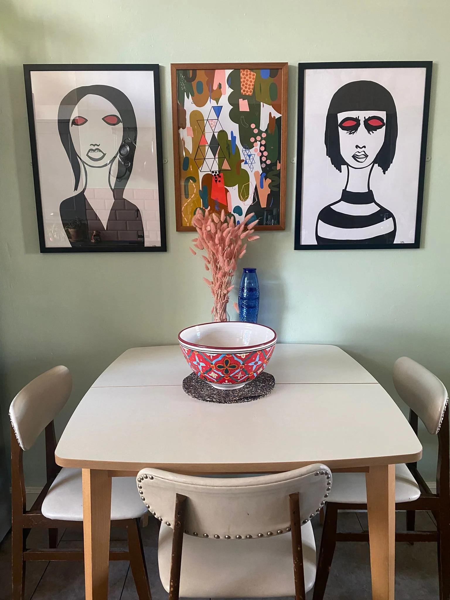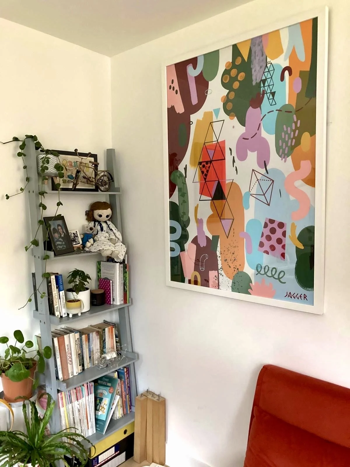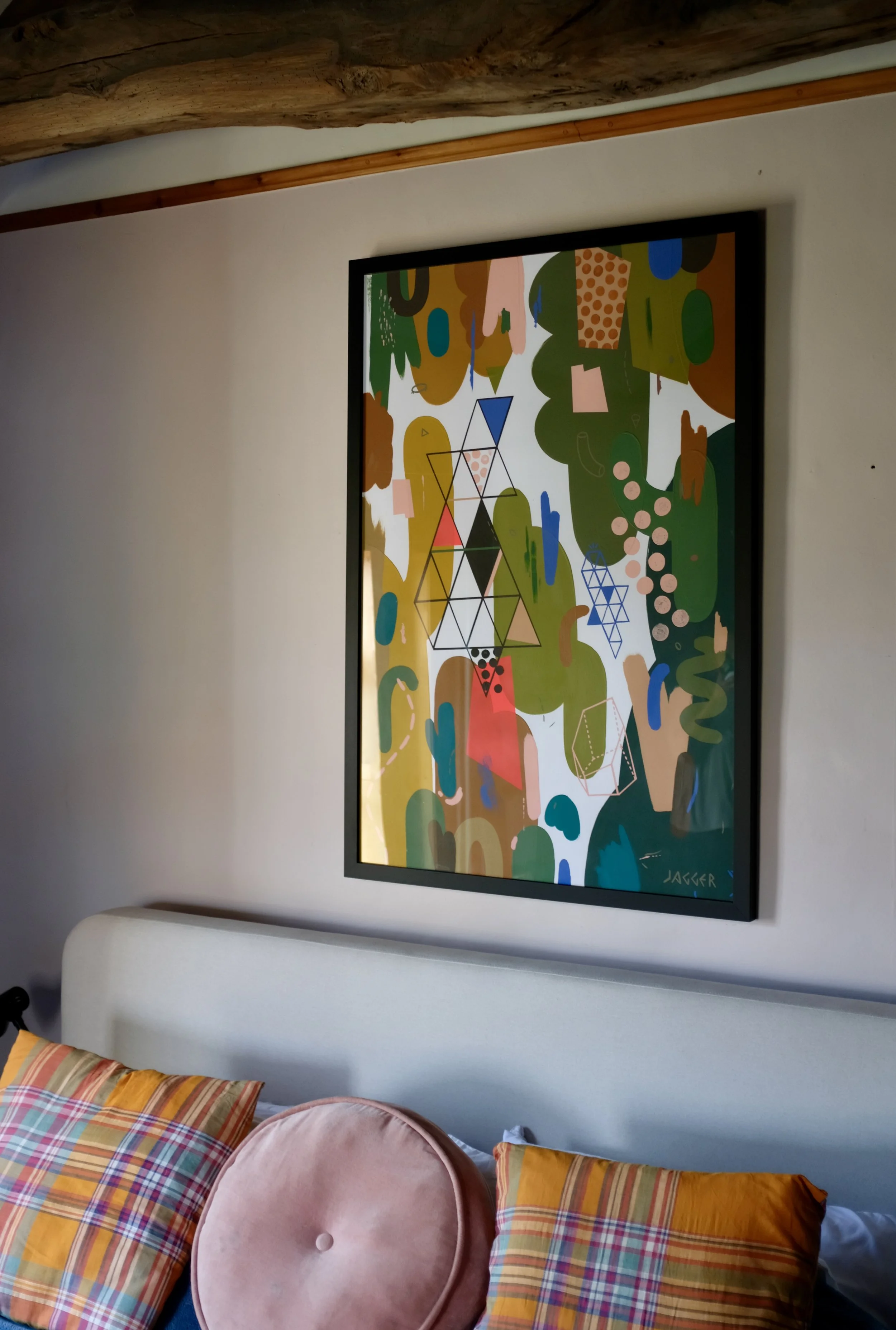 Earthy palette of muted greens, browns and terracotta tones punctuated by pops of coral, yellow and mint.