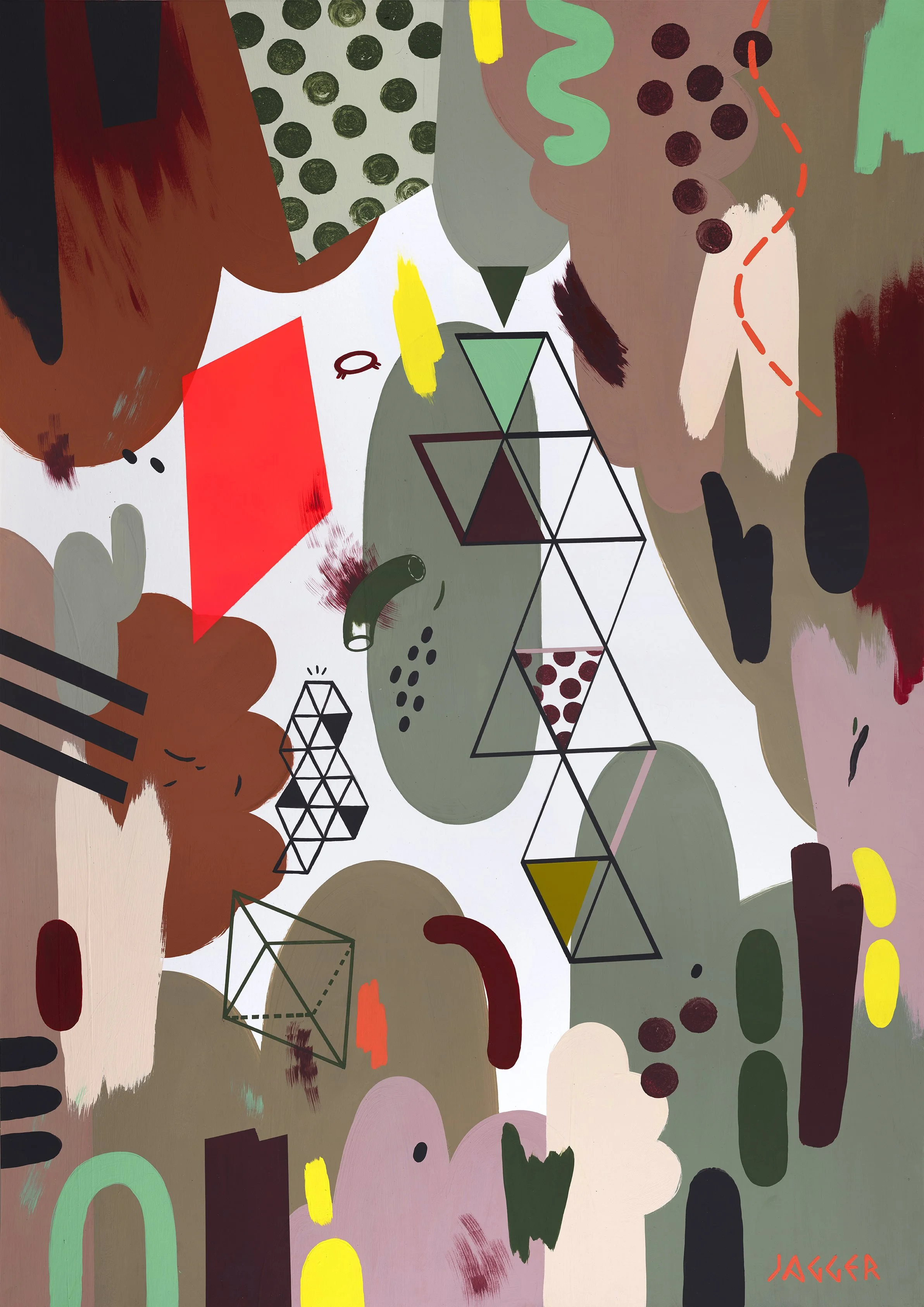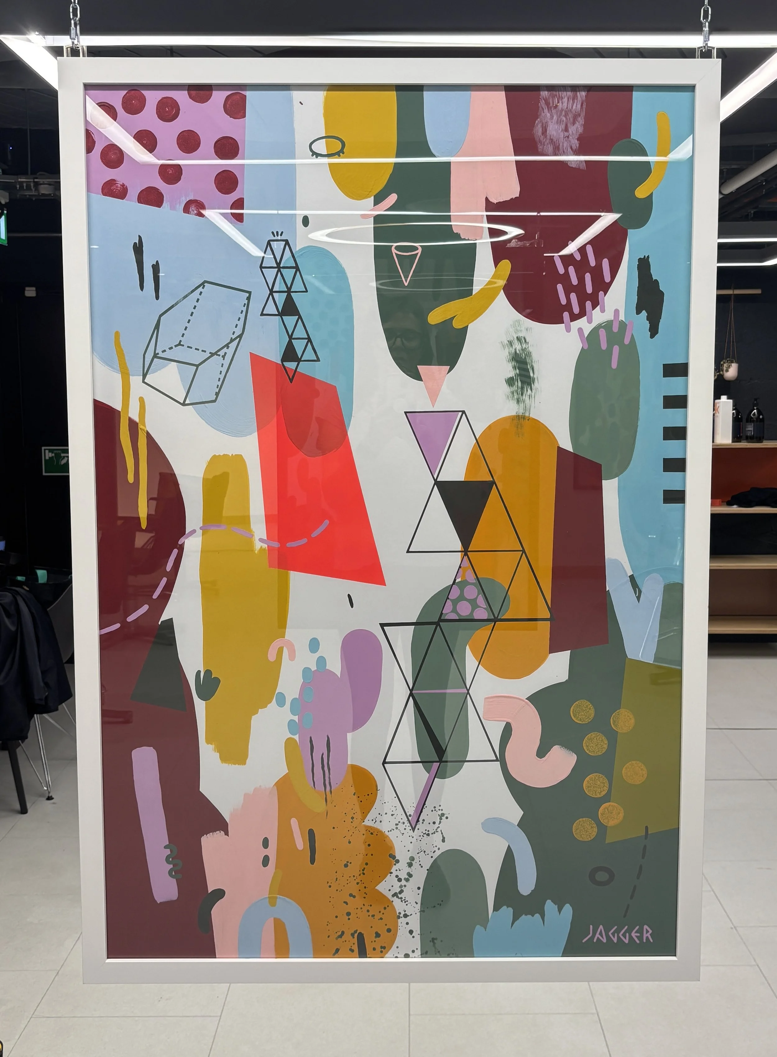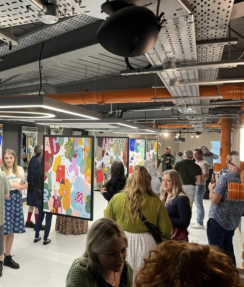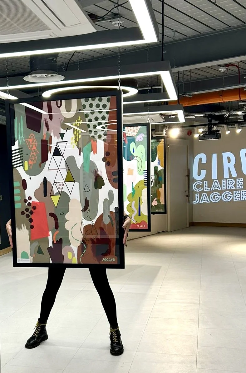 The sell out ‘Circus’ exhibition in August 2025 comprised a series of eight A0 paintings, divided into pairs, each with a distinct colour scheme. Each painting contains a pop of red fluorescent spray paint which ties the body of work together.