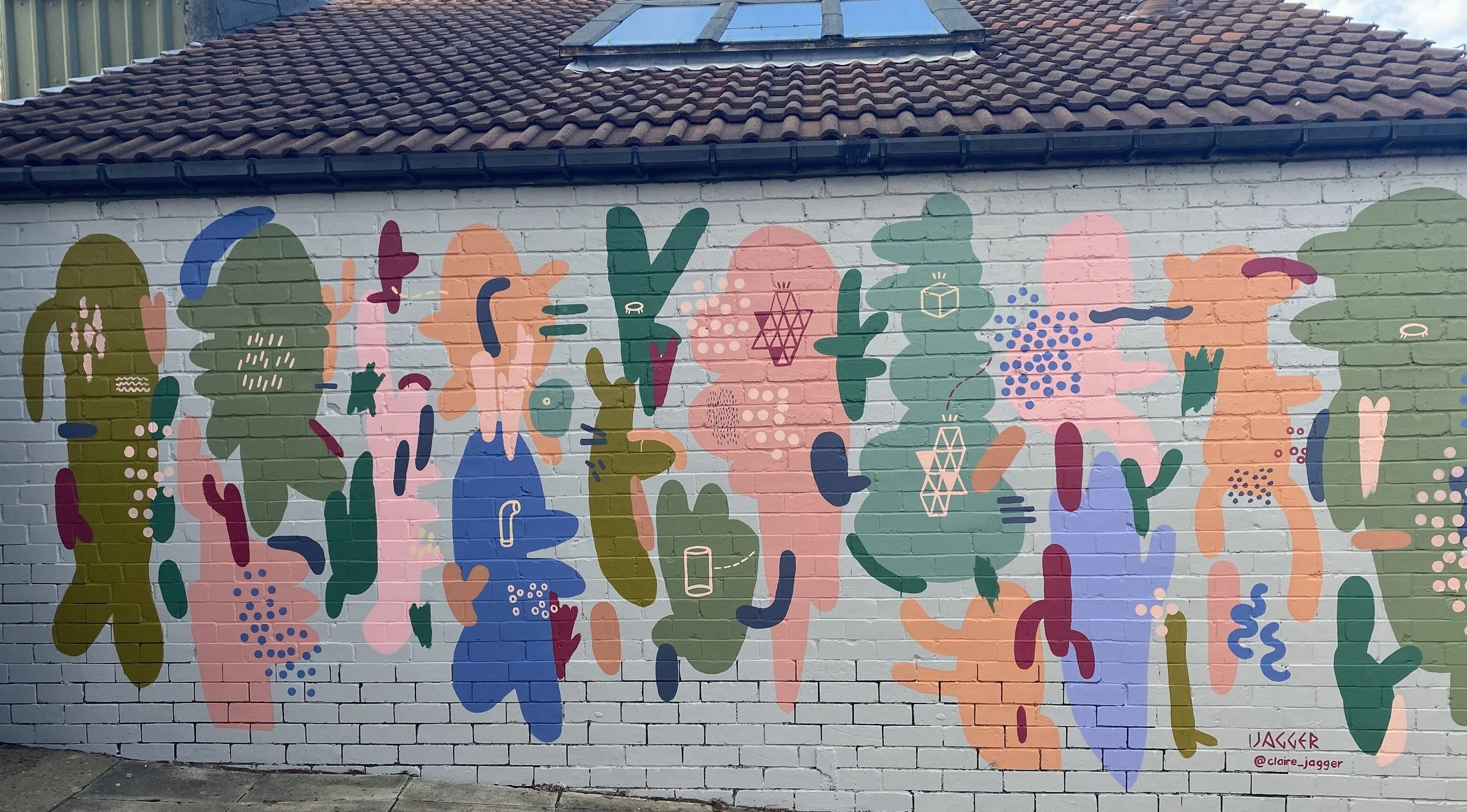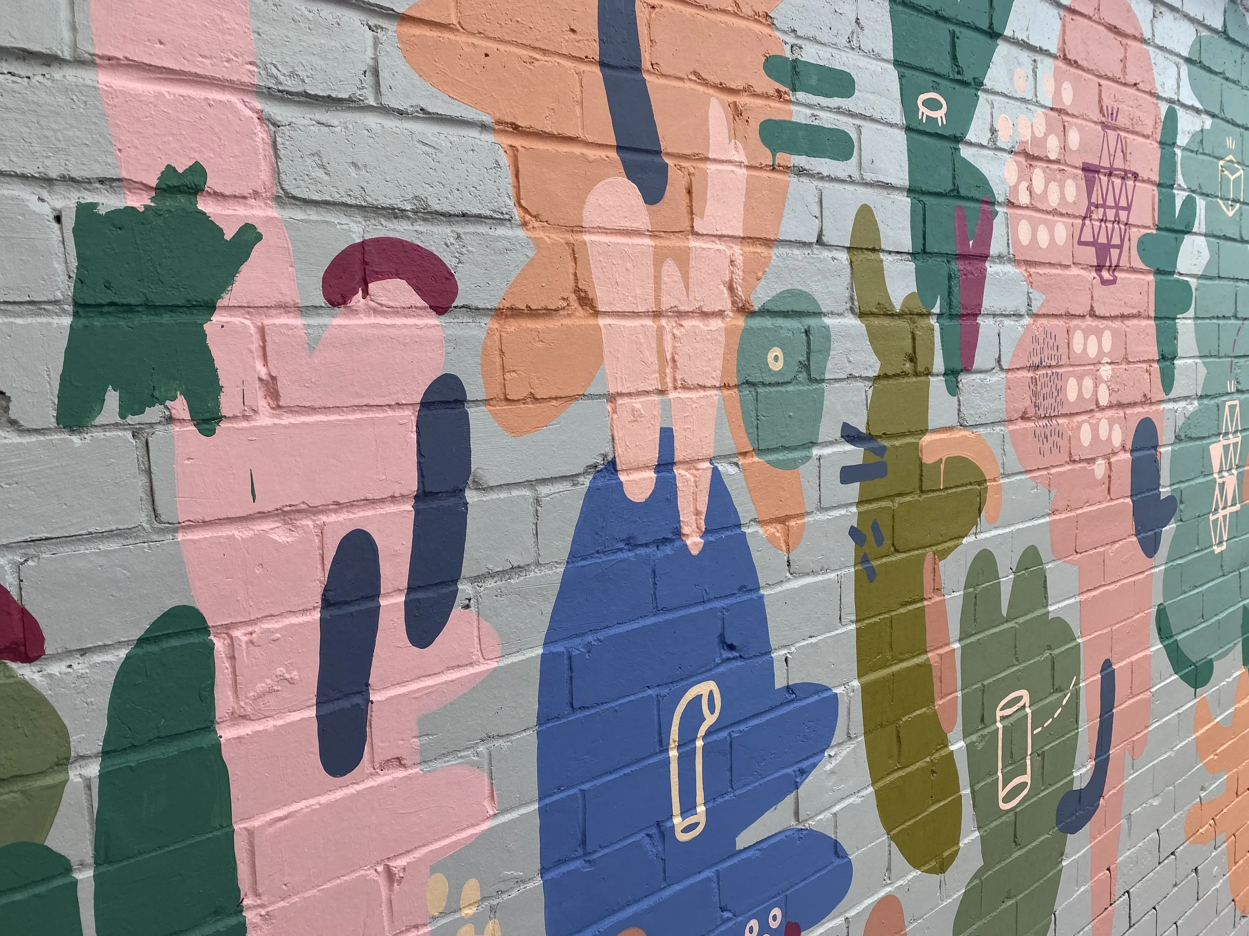 Outdoor mural completed for a private client. The client wanted to improve her outdoor space and wished to use the mural as a backdrop for her fashion designs. I chose colours that would complement her clothes and that would pop in this very bright and sunny space.